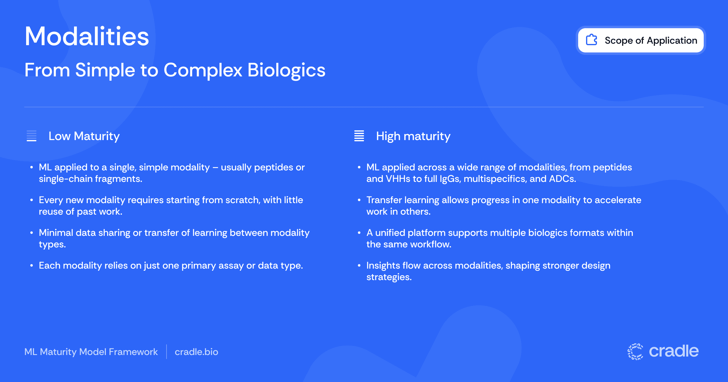 ML maturity in modalities reflects your ability to apply machine learning across increasingly complex biologic formats. Most organizations naturally start at the simpler end of the modality spectrum before addressing the more challenging, and potentially more rewarding, molecular architectures.