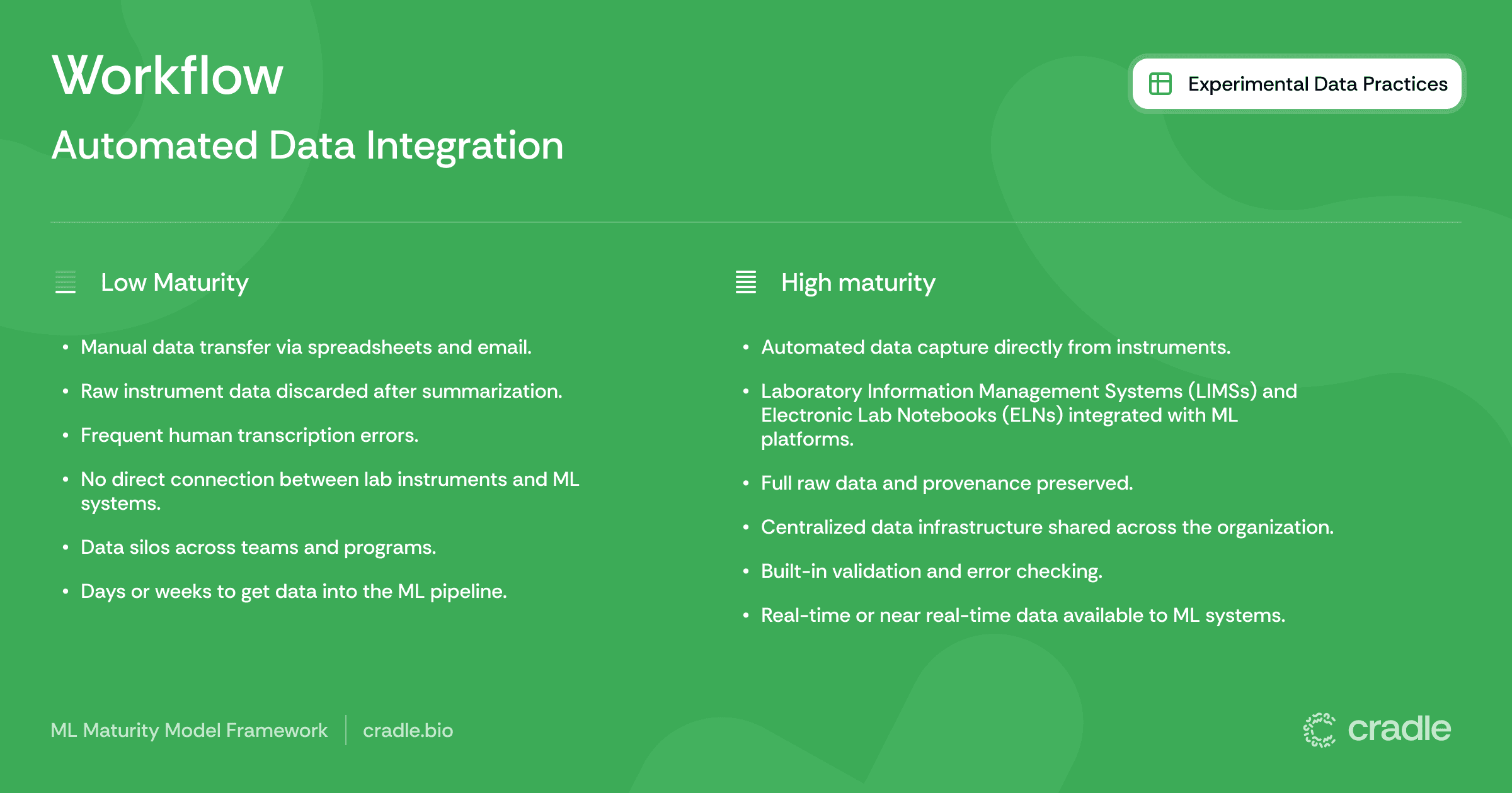 Workflow maturity reflects how data moves from experimental instruments into ML systems, and whether that process preserves fidelity while minimizing human intervention.