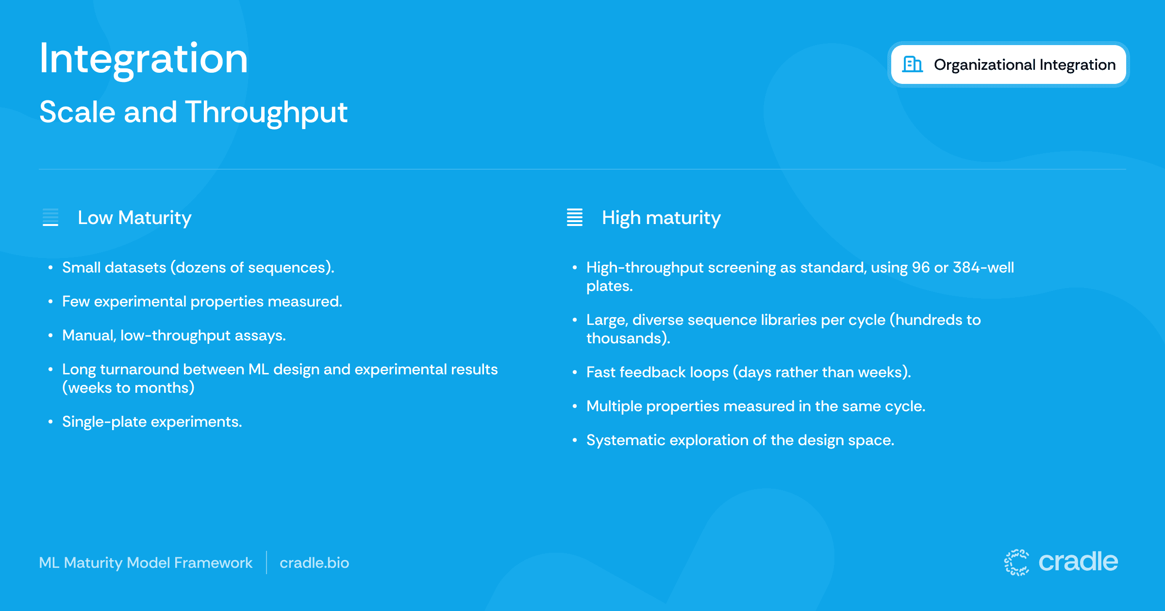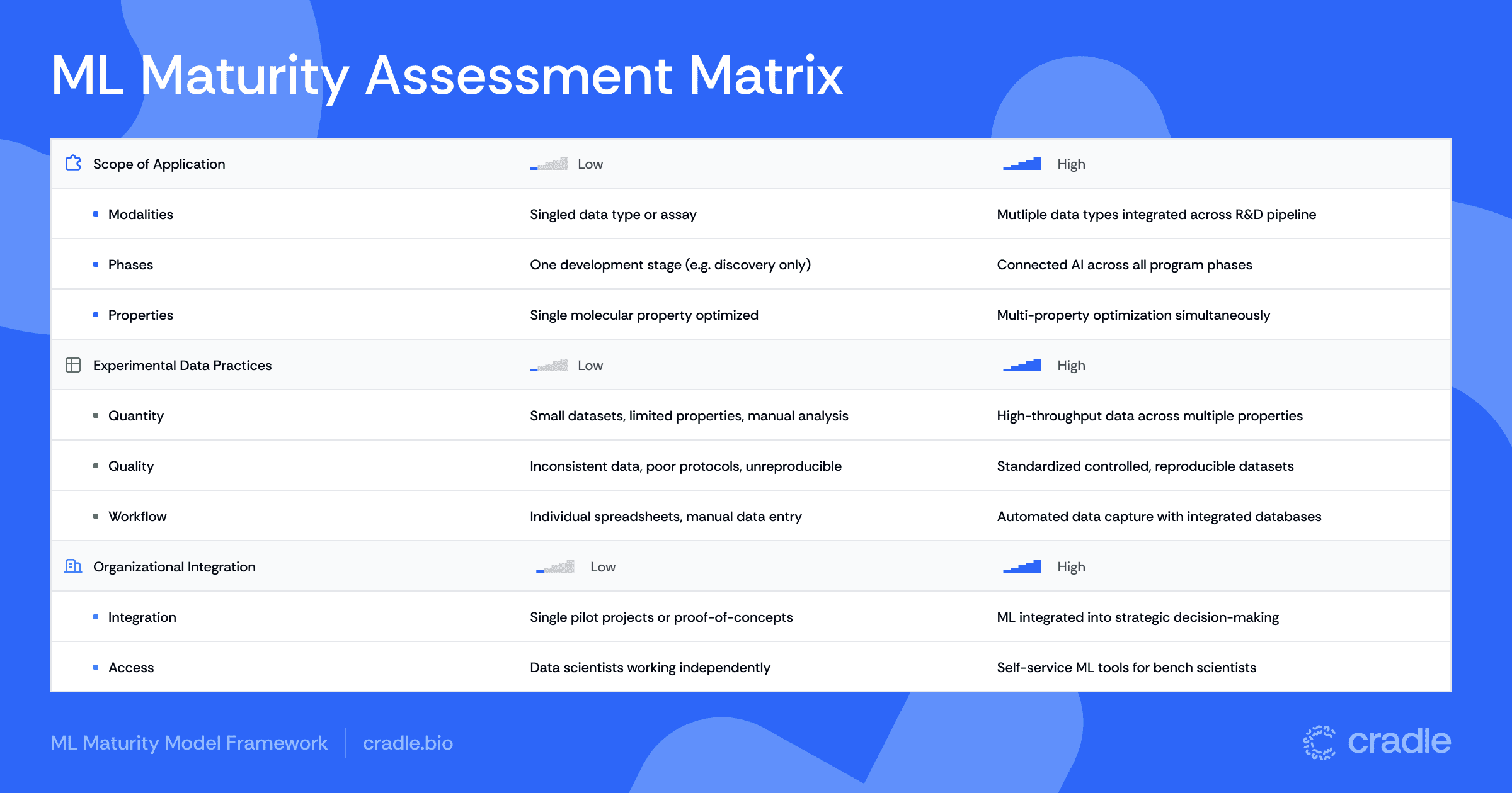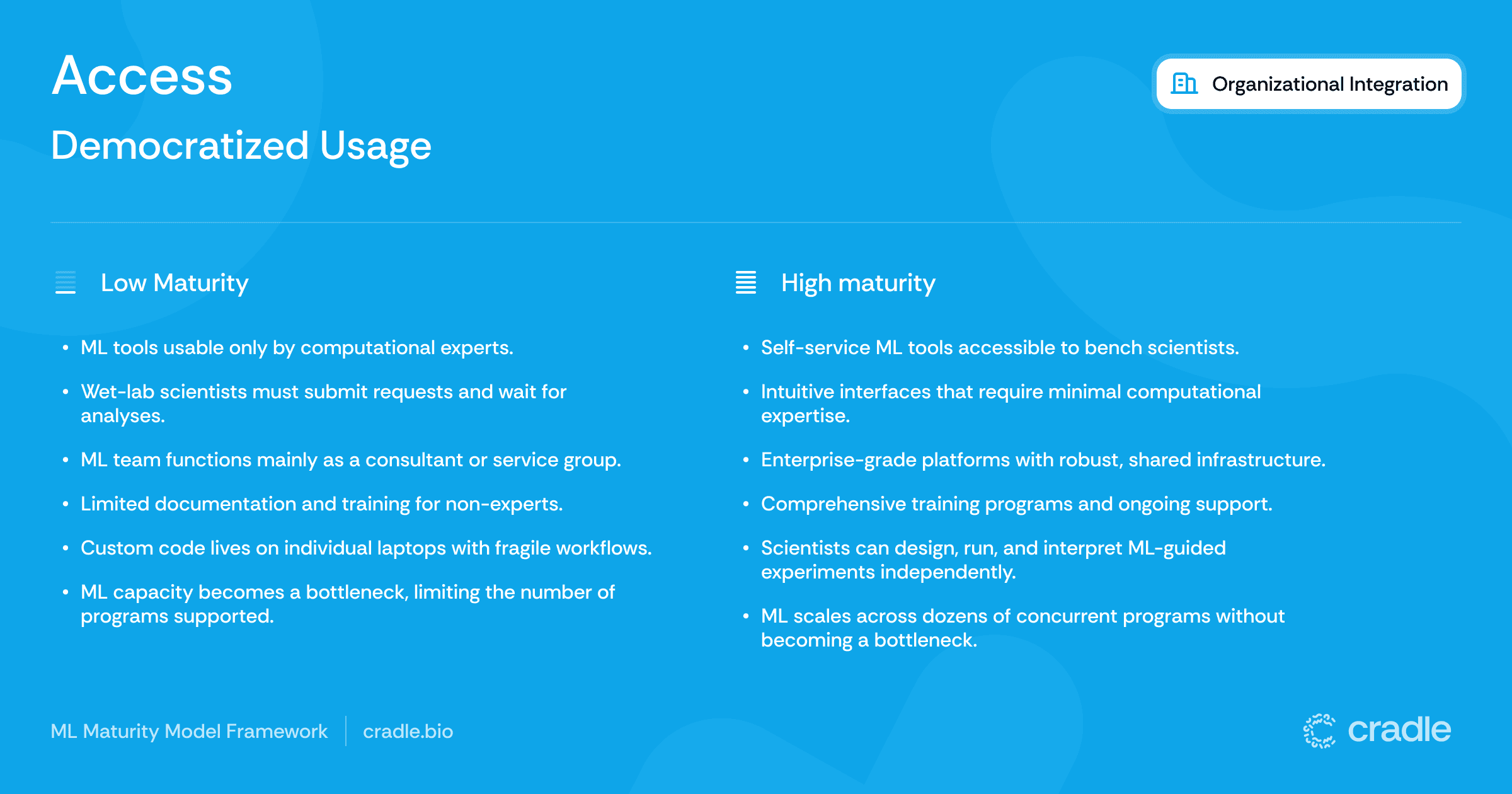 Technology alone doesn’t transform discovery – organizations do. Even the most advanced ML platform is useless if scientists don’t use it, trust it, or weave it into their workflows. That’s why organizational maturity hinges on two factors: the integration of ML into core processes and access to ML across diverse teams. When both are in place, ML becomes a strategic capability rather than languishing in one-off projects and optimistic PowerPoint presentations.