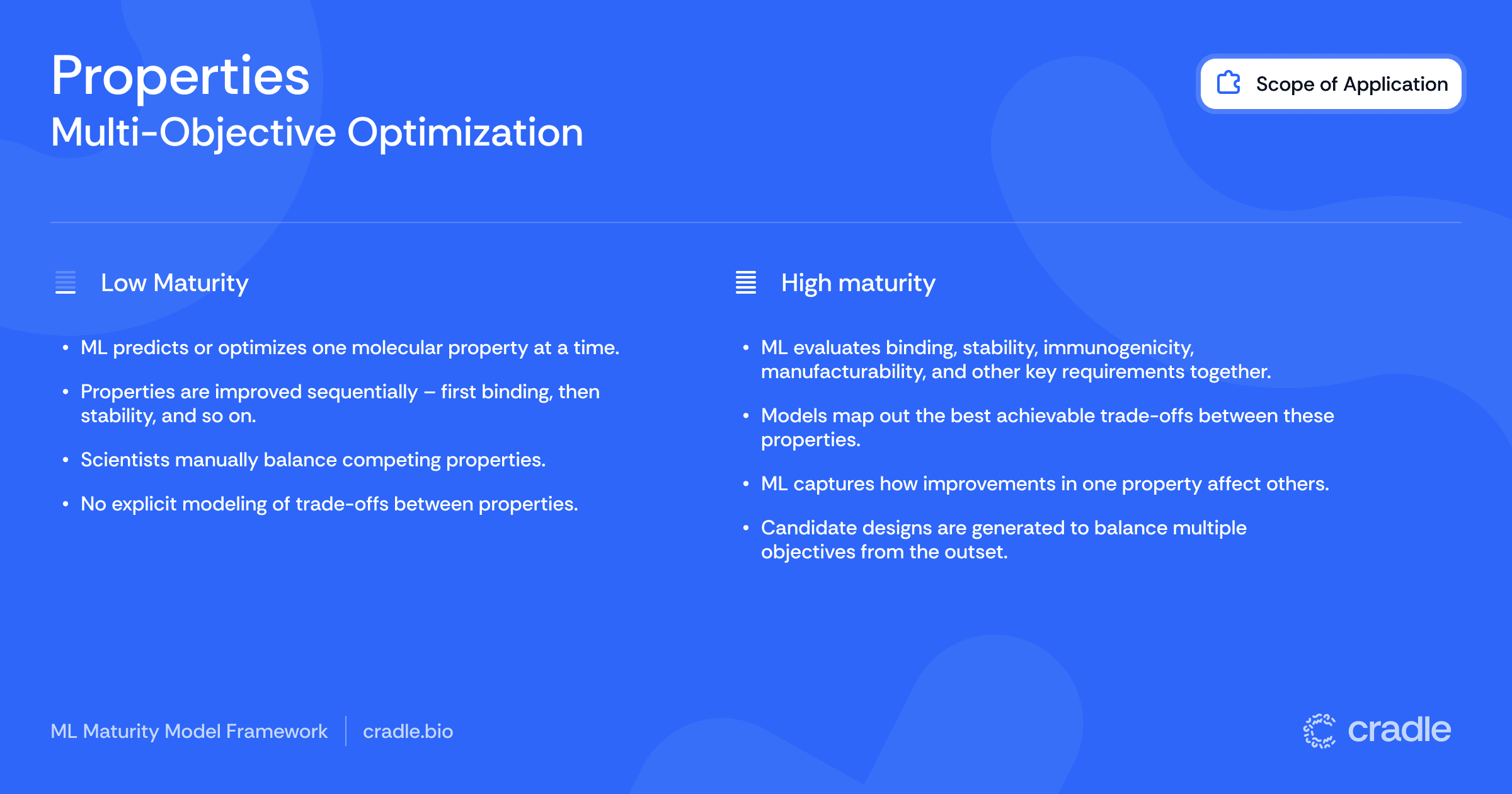 ML maturity in property optimization reflects the ability to evaluate and balance multiple design requirements for each candidate molecule, managing the trade-offs rather than optimizing single properties in isolation.